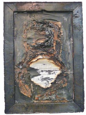 Eine Rauminstallation war das Kunstwerk „Die Zukunft ist keine Zukunft“. Eine verbrannte Wohnungseinrichtung und der Schein der noch züngelnden Flammen bestimmten die Szenerie.