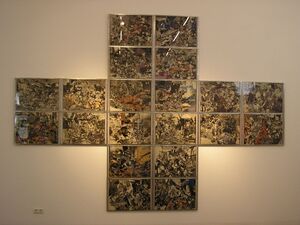 Die raumgreifende, aus Pressefotos zusammen-gesetzte Collage im Kreuzformat ist eine Dokumentation von Barbarei am Ende des 20. Jahrhunderts. Schockierende Pressefotos sind aus dem Zusammenhang der Berichterstattung gerissen, sodass der authentischen Darstellung von Tod und Gewalt eine erkennbare politische Zuordnung entzogen ist.