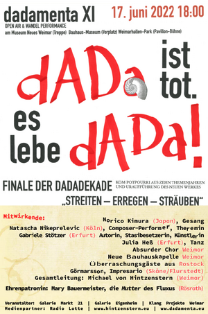Mit einer Open-Air-Performance im Weimarhallen-Park wird das 100. Jubiläum des “Internationalen Kongresses der Dadaisten und Konstruktivisten” gefeiert, auf dem sich am 25. und 26. September 1922 die Speerspitze der europäischen Avantgarde in Weimar versammelte. Zu den Teilnehmern gehörten die Dadaisten Hans Arp, Kurt Schwitters und Tristan Tzara und die Konstruktivisten El Lissitzky, Theo van Doesburg und László Moholy-Nagy.