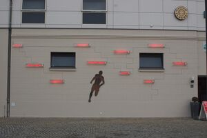 10 Neonschriftzüge, Läuferfigur aus Stahlblech, Plexiglas,